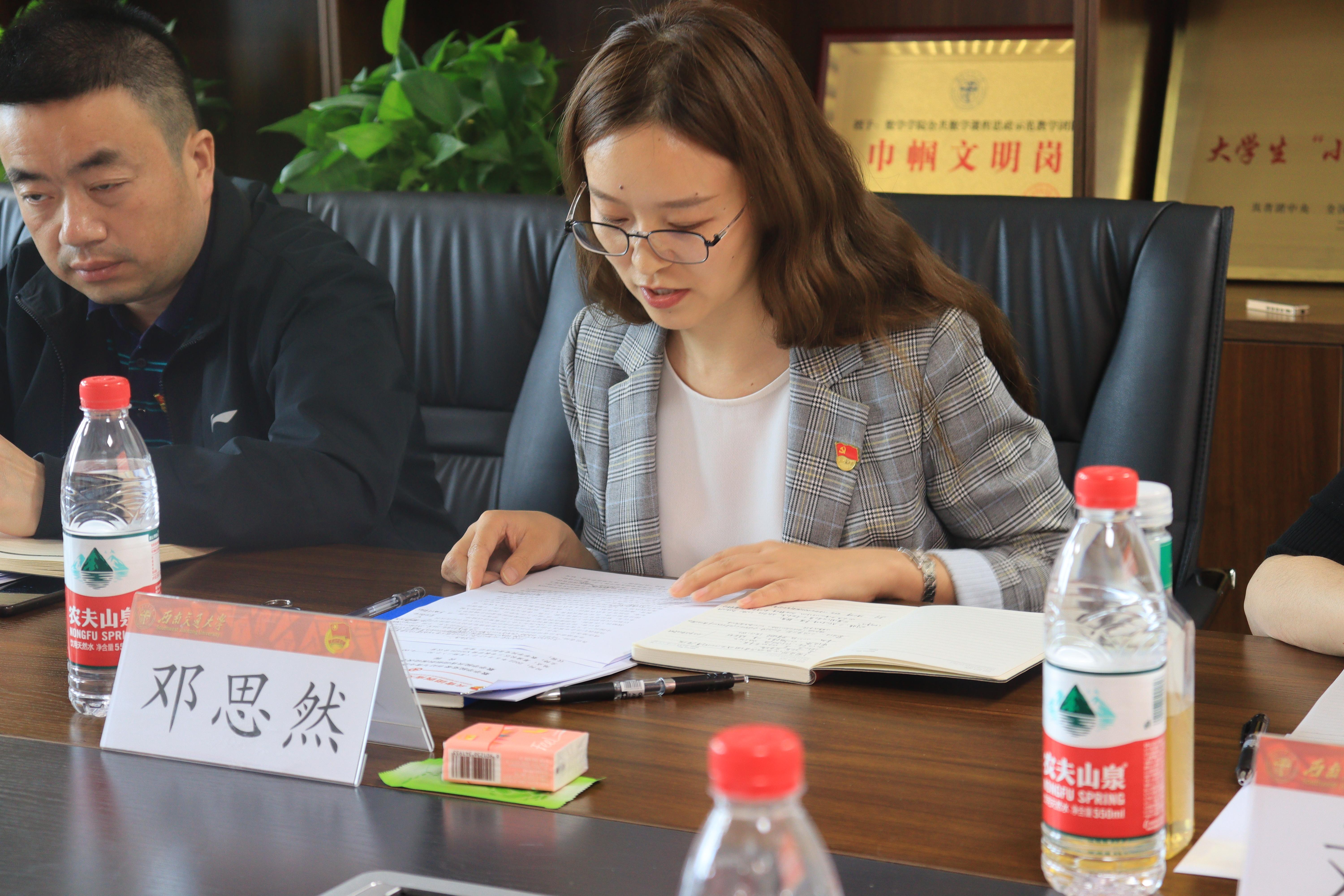 她首先汇报了学院共青团建设取得的出色成绩。她表示,院团委在校党委、校团委、院党委的领导下,围绕立德树人根本任务,强化团员思想引领,扎实开展育人实践工作,取得了良好的育人成效:学院8支队伍荣获团中央知行计划大学生优秀实践队称号,1名同学走进基层赴金牛区西安路街道办挂职锻炼,2名本科生投身西部计划参与学校研究生支教团,8名同学参与学校青马工程精英人才班、骨干人才班历练。这些优秀青年以自身的实际行动,影响着数院青年学子积极投身新时代的火热实践中,形成了一股强大的朋辈力量。