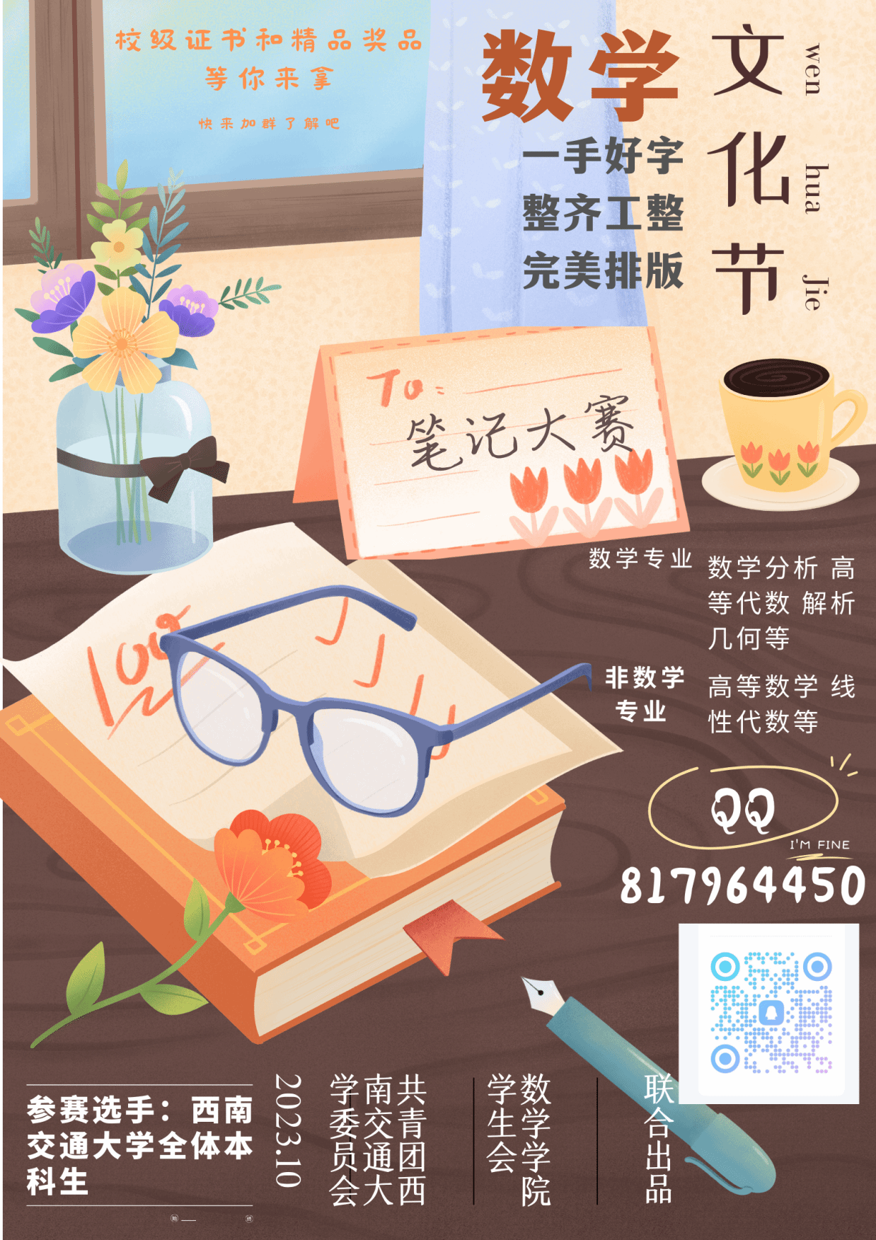 为进一步加强学风建设,发挥优秀数学笔记的模范带头作用,加强同学之间的学习交流,树立良好的学习之风,宣传优秀学习榜样,夯实学科基础,形成学数学、懂数学、爱数学的良好氛围。传承“严谨治学,严谨要求”的交大传统,增强同学们数理强国的信念,特举办2138cc太阳集团第三届数学课程笔记大赛。