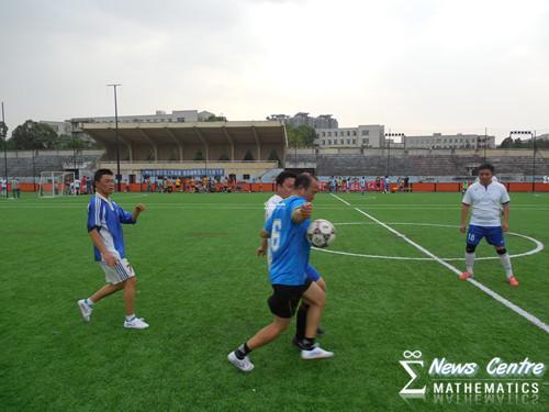 After four-round fierce games, the finals of 2015 Southwest Jiaotong University Faculty Five-men Soccer Competition arrives on 17th April. At 17:00 sharp, the spectacular rivalry between the School of Mathematics and the School of Geosciences and Environmental Engineering kicked off. Special concentrations were attached to the game. Accompanied by the Secretary of Youth League Committee, instructor for the students of 2012 Xu Haijing, Deputy Party Secretary Li Zhihui not only cheered for the athletes, but also joined in the latter half of the match, fighting shoulder-to-shoulder with the teachers from the School of Mathematics.