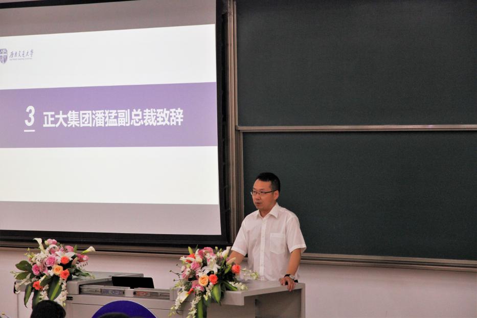 开幕式第二项,由正大集团潘猛副总裁代表企业方致辞,潘猛副总裁向大家简单介绍了正大集团的企业文化以及“人才第一、以人为本”的企业理念,鼓励同学们努力拼搏、力争上游,在本次比赛中取得优异成绩。